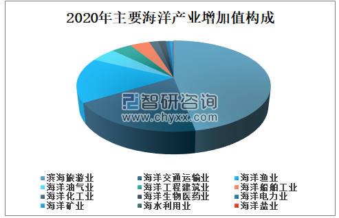 2020年我国主要海洋产业全年增加值29641亿元,其中,海水利用业实现增加值19亿元,占主要海洋产业的0.06%;海洋交通运输业实现增加值5711亿元,占主要海洋产业的19.3%;海洋渔业实现增加值4712亿元,占主要海洋产业的15.9%。