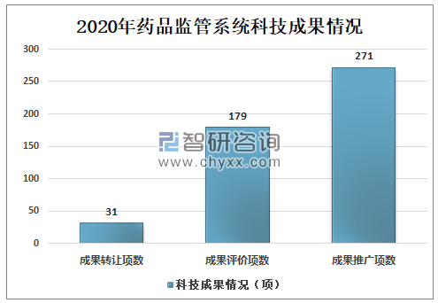 科技成果是指通过科学研究与技术开发所产生的具有实用价值的成果,国家全面加强科技成果管理,推动科技成果资源共享利用,促进科技成果转化,提高食品药品监管效率,提升监管水平。2020年,我国药品监管系统科技成果转让项数31项,转让费合同金额538.3万元;成果评价项数179项;成果推广项数271项。
