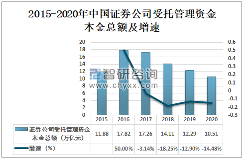 证券业务作为中国金融领域重要板块,设计大量交易和资金流动。截至2020年底,我国证券公司受托管理资金本金总额10.51万亿元,较上年减少1.78万亿元,同比下降14.48%。