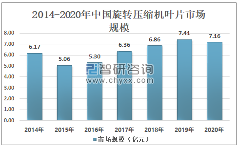 智研咨询发布的《2021-2027年中国压缩机叶片行业市场全景调研及发展趋势分析报告》数据显示:2019年中国旋转式压缩机叶片市场规模约为7.41亿元,同比增长8.0%;2020年中国旋转式压缩机叶片市场规模为7.16亿元左右,同比下降3.3%。