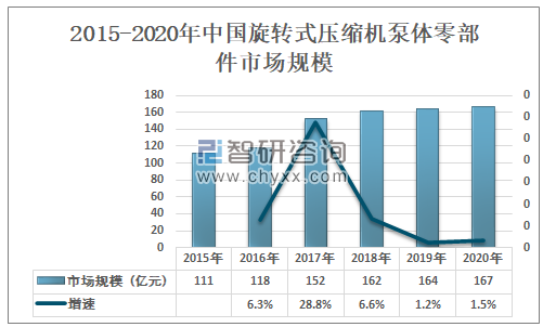 中国旋转式压缩机泵体零部件的市场规模由2015年的111亿元增加至2020年的167亿元左右,年复合增长率约为8.5%。随着科技的进步,旋转式压缩机泵体零部件的市场规模预计会进一步提高。