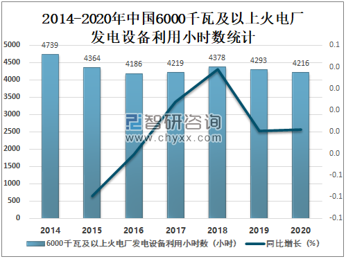 2014-2020年中国6000千瓦及以上火电厂发电设备利用小时数统计