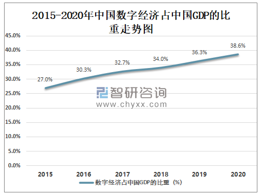 2015-2020年中国数字经济占中国GDP的比重走势图