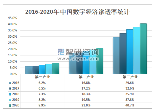 2016-2020年中国数字经济渗透率统计