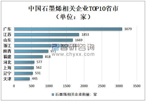 从地区分布来看,我国石墨烯相关的企业大多分布在广东、江苏、山东等地。广东省目前共有3079家石墨烯相关企业,企业数量位居全国第一;江苏省共1853家石墨烯相关企业,排名第二;山东省有1669家石墨烯相关企业,位列第三。