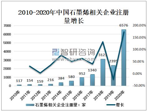 智研咨询发布的《2021-2027年中国石墨烯行业市场研究分析及发展规模预测报告》数据显示:2010年以来,我国石墨烯相关企业的注册量呈增长趋势,2017年之前石墨烯相关企业年注册量均在1000家以内;2018年石墨烯相关企业注册量3121家,同比增长了132.9%;2020年增长迅猛,石墨烯相关企业注册量高达为6576家,同比增长了174.6%。