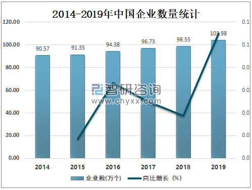 智研咨询发布的《2021-2027年中国企业信息化行业市场行情动态及发展前景展望报告》数据显示:中国企业数量逐年增加,2019年中国共有103.98万个企业,较2018年增加了5.43万个,同比增长5.51%。