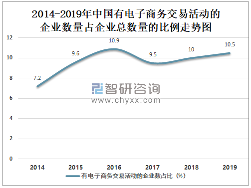 总体来看中国有电子商务交易活动的企业数量占企业总数量的比例呈增长趋势,2019年中国有电子商务交易活动的企业数量占企业总数量的10.5%,较2014年的7.2%增长了3.3%。