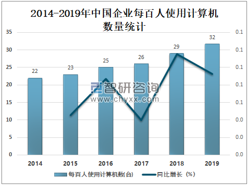 中国企业每百人使用计算机数量逐年增加,2019年中国企业每百人使用计算机数量达32台,较2018年增加了2.68台,同比增长9.24%。