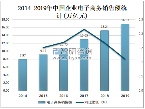 随着中国有电子商务交易活动的企业数量的增加,电子商务销售额也随着增长,2019年中国企业电子商务销售额达16.93万亿元,较2018年增加了1.69万亿元,同比增长11.09%。