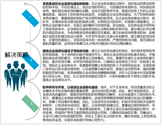 面对企业信息化建设中存在的问题,解决策略主要有:系统集成对企业信息化建设的影响;提高企业信息化建设子系统的功能;软件研究与开发,以促进企业信息化建设等。