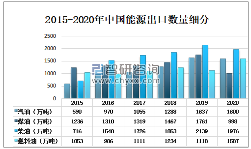 2015-2020年中国能源出口数量细分