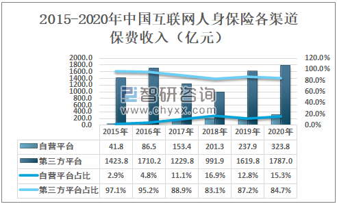 互联网人身险的发展格局呈现出以第三方平台为主、自营平台为辅的趋势。2020年自营平台互联网人身险保费收入为323.8亿元,第三方平台互联网人身险保费收入为1787.0亿元。