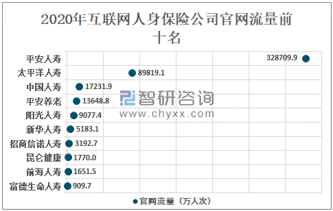 2020年互联网人身保险公司官网流量前五名依次为平安人寿、太平洋人寿、中国人寿,平安养老、阳光人寿,官网流量依次为328709.9万人次、89819.1万人次、17231.9万人次、13648.8万人次、9077.4万人次。