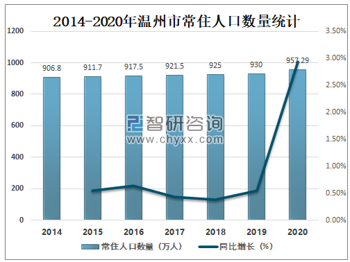 温州市,简称“温”或“瓯”,是浙江省地级市,国务院批复确定的东南沿海重要的商贸城市和区域中心城市。温州地处中国华东地区、浙江东南部、瓯江下游南岸,东濒东海、南毗福建、西及西北部与丽水市相连、北和东北部与台州市接壤,是长江三角洲中心区27城之一,是中国数学家的摇篮、中国南戏的故乡、中国海鲜鸡蛋之乡、中国鞋都。近年来温州市常住人口数量逐年攀升,2020年温州市常住人口数量达957.29万人,较2019年增加了27.29万人,同比增长2.93%。