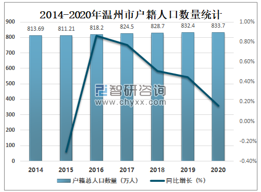 温州市户籍人口数量逐年攀升,2020温州市户籍人口数量达833.7万人,较2019年增加了1.3万人,同比增长0.16%。