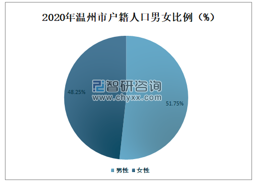 2020年温州市男性户籍人口数量占全市户籍人口总数的51.75%,占比较大;女性户籍人口数量占全市户籍人口总数的48.25%,占比较小。