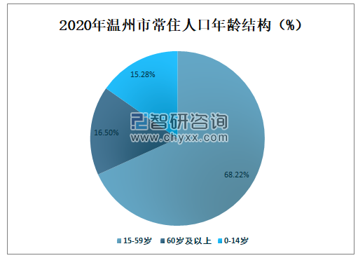 2020年温州市15-59岁常住人口数量占全市常住人口总数的68.22%,占比最大;60岁及以上常住人口数量占全市常住人口总数的16.50%;0-14岁常住人口数量占全市常住人口总数的15.28%。