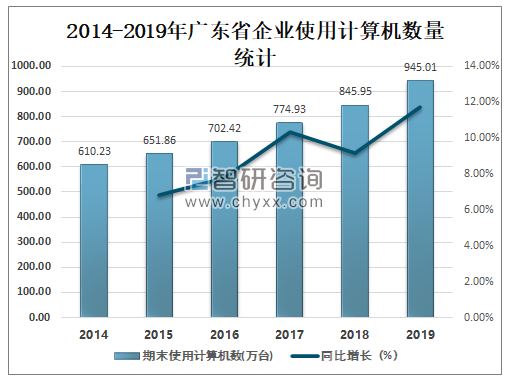 随着广东省企业数量的增加,以及企业信息化进程的不断推进,广东省企业使用计算机数量逐年增加,2019年广东省企业使用计算机数量达945.01万台,较2018年增加了99.06万台,同比增长11.71%。
