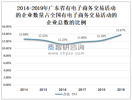 总体来看广东省有电子商务交易活动的企业数占广东省企业总数的比例呈增长趋势,2019年广东省有电子商务交易活动的企业数占广东省企业总数的10.8%,较2014年的8.9%增长了1.9%。