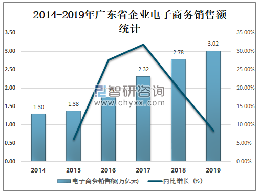 随着广东省有电子商务交易活动的企业数量的增加,电子商务销售额也随着增加,2019年广东省企业电子商务销售额达3.02万亿元,较2018年增加了0.23万亿元,同比增长8.40%。