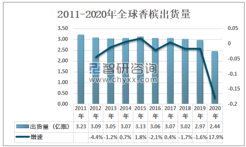 2020年受疫情影响严重,全球许多餐厅、酒吧等娱乐场所不得不关闭,导致2020年全球香槟酒销量大幅下滑,2020年全球香槟酒销量为2.44亿瓶,较2019年的2.97亿瓶同比下降17.9%。
