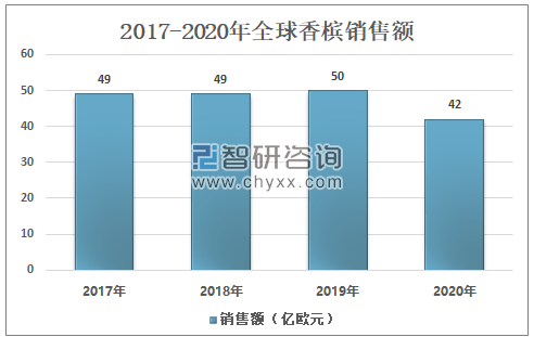 智研咨询发布的《2021-2027年中国香槟行业发展战略规划及投资方向研究报告》数据显示:2019年全球香槟销售额为50亿欧元,2020年全球香槟销售额为42亿欧元,同比下降16%,其中美国、英国和日本等几个主要市场香槟销售额均有不同程度下跌。