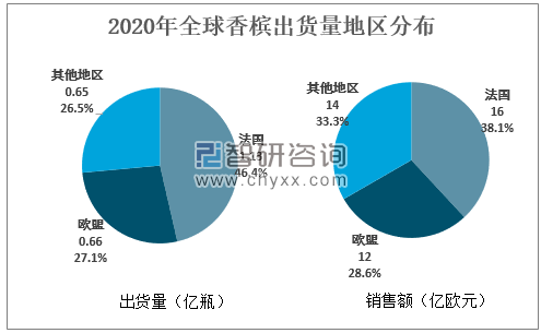 法国是全球最大的香槟出货地,2020年法国香槟出货量为1.13亿瓶,占全球总出货量的46.4%;销售额为16亿欧元,占全球总销售额的38.1%。欧盟地区香槟出货量为0.66亿瓶,销售额为12亿欧元。