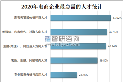2020年淘宝天猫等传统运营人才需求占51.02%;新媒体、内容创作、社群方向人才需求占47.96%;主播(助理)、网红达人方向人才需求占46.94%;客服、地推、网销等向人才需求占39.80%;专业数据分析与应用人才需求占22.45%。近两年来,主播(助理)、网红、达人方向人才需求增长迅速,