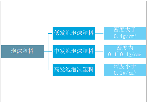 按泡沫塑料的密度可分为低发泡、中发泡和高发泡泡沫塑料。密度大于0.4g/cm3的为低发泡泡沫塑料,密度为0.1~0.4g/cm3的为中发泡泡沫塑料,密度小于0.1g/cm3的为高发泡泡沫塑料。