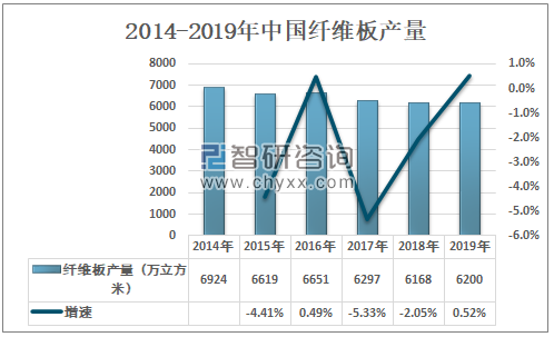 从2012年开始中国纤维板产量增速放缓,逐渐告别高增长时代,行业进入结构调整期,落后产能逐步淘汰,供需关系趋于平衡。2019年中国纤维板产量为6200万立方米,较2018年的6168万立方米同比增长0.52%。
