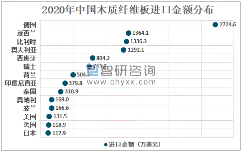 智研咨询发布的《2021-2027年中国木质纤维板行业市场运营格局及投资前景趋势报告》数据显示:2020年中国木质纤维板进口金额前五地区依次为德国、新西兰、比利时、澳大利亚、西班牙,进口金额分别为2724.6万美元、1364.1万美元、1336.3万美元、1292.1万美元、804.2万美元。