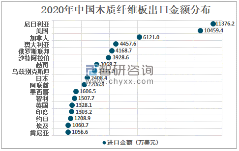 2020年中国木质纤维板出口金额TOP5地区分别为尼日利亚、美国、加拿大、澳大利亚、俄罗斯联邦,出口金额为11376.2万美元、10459.4万美元、6121.0万美元、4457.6万美元、4168.7万美元。