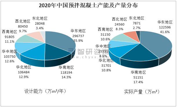 因商品混凝土运输时间和运输半径的限制,行业呈现一定的区域性特征;中国预拌混凝土产能及产量主要集中在华东地区,其中华东地区产能为296737万m³/年,占全国总产能的35.9%;产量为122596万m³,占全国总产量的41.6%。其次为华南地区,产能占比14.3%,产量占比17.4%。