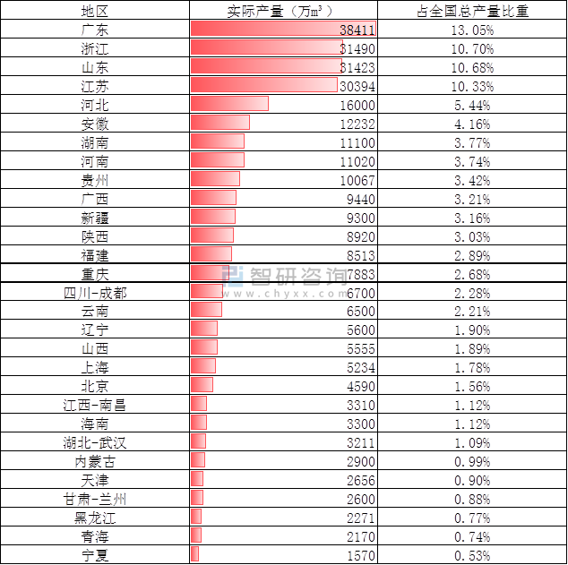2020年有4个省份中国预拌混凝土产量超过30000万m³,其中广东省产量居全国首位,2020年达到38411万m³,占全国总产量的13.05%;浙江省产量为31490万m³,占全国总产量的10.70%;山东省产量为31423万m³,占比10.68%。