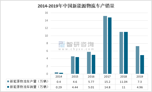 2014-2017年中国新能源物流车市场从无到有,逐步发展到2017年新能源物流车产销量达到15.2万辆;2017年以后,新能源物流车产销量双双下跌,2019年新能源物流车产量7.3万辆,较上年减少3.74万辆,同比下降33.88%;新能源物流车销量4.96万辆,较上年减少6.04万辆,同比下降54.91%。