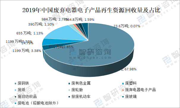 据商务部数据,2019年中国废弃电器电子产品再生资源回收数量为390万吨,占总再生资源产品的1.1%。
