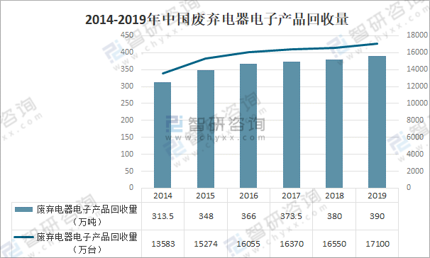 电子废弃物生产步骤复杂,资源损耗率高,但同时,它潜在的回收价值也不能忽视。电子废弃物中含有约40%的金属30%的塑料以及30%的氧化物。其中2019年中国废弃电器电子产品回收量为390万吨,回收数量为17100万台。
