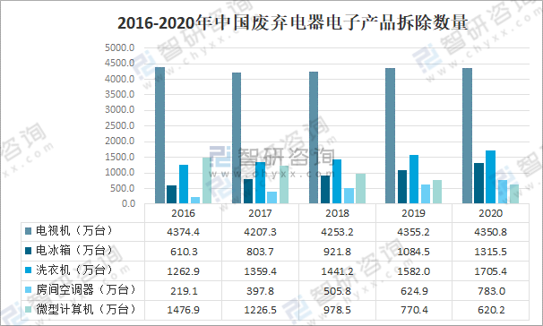 《废弃电器电子产品处理目录(第一批)》包括电视机、电冰箱、洗衣机、房间空调器及微型计算机五类产品。2020年中国电视机拆除数量约为4350.8万台,同比下降0.1%;报废电冰箱拆除数量约为1315.5万台,同比增长21.3%;洗衣机拆除数量约为1705.4万台,同比增长7.8%;房间空调器拆除数量约为783万台,同比增长25.3%;微型计算机拆除数量约为620.2万台,同比下降19.5%。