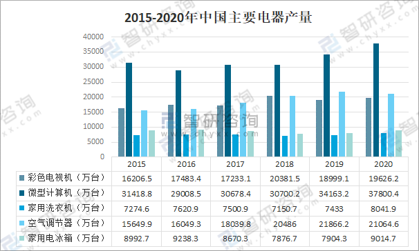 电子产品是以电能为工作基础的相关产品,主要包括:手表、智能手机、电话、电视机、影碟机(VCD、 SVCD、DVD)、录像机、摄录机、收音机、收录机、组合音箱、激光唱机(CD)、电脑、游戏机、移动通信产品等。因早期产品主要以电子管为基础原件故名电子产品。2020年中国彩色电视机产量为19626.2万台,同比增长3.3%;微型计算机产量为37800.4万台,同比增长10.6%;家用洗衣机产量为8041.9万台,同比增长8.2%;空气调节器产量为21064.6万台,同比下降3.7%;家用电冰箱产量为9014.7万台,同比增长14%。