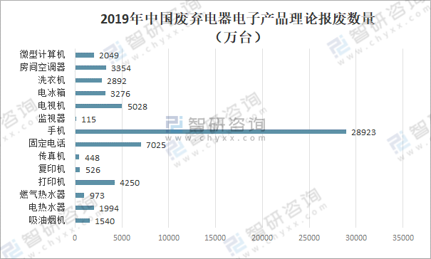 其中2019年中国废弃电器产品理论报废数量最多的为手机28923万台;再次是固定电话报废数量7025万台。