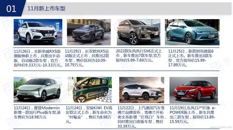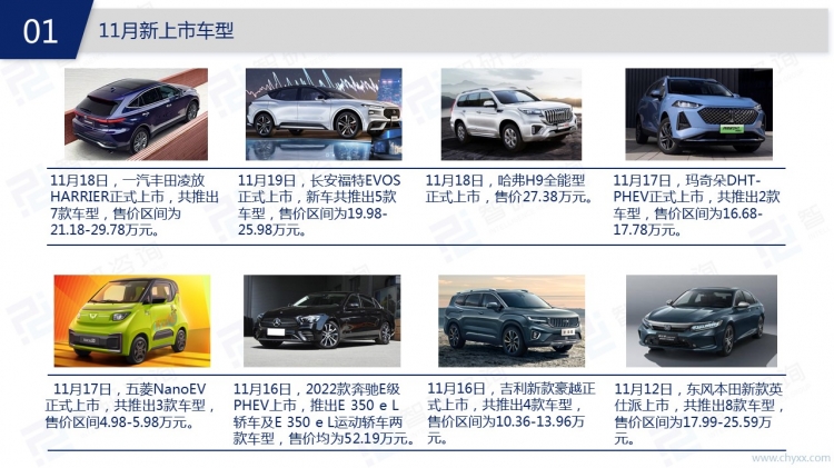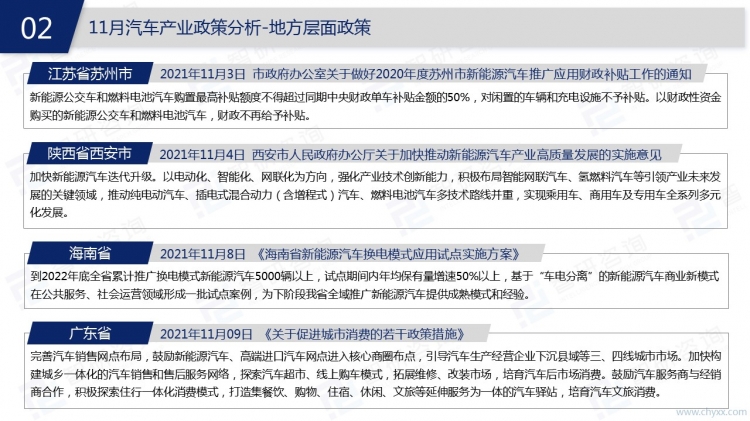 从2021年11月汽车产业动态来看,在政策方面,工业和信息化部、国务院等国家部委发布了包括《关于加强产融合作推动工业绿色发展的指导意见》、《新能源汽车废旧动力蓄电池综合利用行业规范条件(第三批)》等一系列汽车行业相关政策,主要涉及新能源汽车动力电池、智能网汽车、车载卫星定位系统等方面。浙江省、上海市等地方政府也相继出台了汽车产业相关政策。在新车上市方面,特斯拉、北京现代、广汽丰田等品牌均有新车上市;在融资方面,汽车产业融资仍主要集中在上游领域,其中零部件及智能驾驶行业投资热度较高,中游共有5起融资,下游融资数量仅1起。