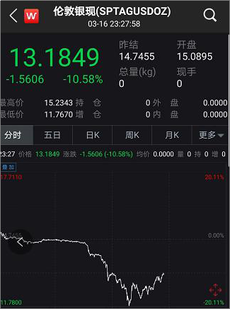 晚间现货白银迅速崩盘,伦敦银现跌幅一度超过20%,失守12美元/盎司关口。随后黄金也开启崩盘模式,一度跌破1460美元/盎司,较日内高点跌逾100美元。
