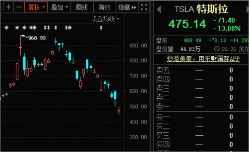 特斯拉开盘后股价一度下跌19%,最低价一度达到442美元,股价较2月的最高点每股944美元已腰斩,市值损失超900亿美金,此前加拿大皇家银行将该股目标价降至380美元。
