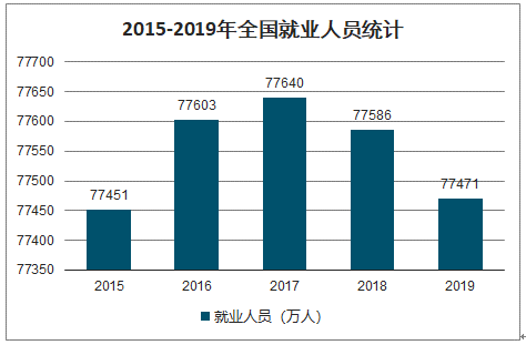 2019年年末全国就业人员77471.0万人,其中城镇就业人员44247.0万人。2019年全年城镇新增就业1352 万人, 有 546万城镇失业人员实现再就业,就业困难人员就业179万人。年末城镇登记失业率为3.62%。