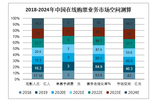随着中国线上票补取消,用户观影频率提高,以及在线购票比例增长,中国在线票务市场将呈稳步增长趋势。预计到2024年,在线票务业务市场空间达到66.5亿元左右。
