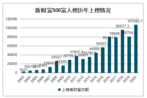 2020年,新财富500富人榜再次创造了历史,上榜的500富人掌握财富突破10万亿大关,高达10.7万亿元,创下历史新高,已经相当于2019年中国GDP的1/10。2019年,上海GDP3.8万亿元,北京、深圳各自为3.5万亿、2.7万亿元,三城相加正好10万亿。