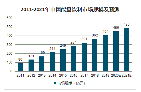 我国能量饮料市场起步较晚。1995年底红牛进入中国标志着我国能量饮料产业的正式起步,此后行业呈现快速增长。中国能量饮料市场规模从2011年到2018年保持年年增长的趋势,从2011年仅90亿元,到2018年涨至362亿元,其增长势力不容小觑。预计在2021年,将涨至486亿元,增长迅猛,潜力巨大。