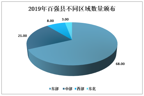 从区域分布看,百强县整体上呈现东多西少的趋势,其中东部地区占68席,约七成;中部地区占21席,约两成;西部地区稳中有进,占据8个席位;东北地区保持平稳,保持3个席位。与2019年相比,东部地区席位减少3位,中部地区增加2席,西部地区增加1席位。