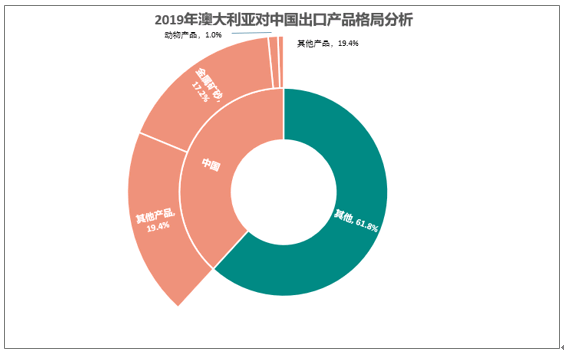 以金属矿砂为主的矿产品一直是澳大利亚对中国出口的主力产品,2019年出口额为713.9亿美元,增长29.0%,占澳对中国出口总额的68.7%。动物产品是澳对中国出口的第二大类商品,出口额41.8亿美元,增长47.3%,占澳对中国出口总额的4.0%。纺织品及原料是澳对中国出口的第三大类商品,出口额25.0亿美元,增长4.0%,占澳对中国出口总额的2.4%。由于矿产品在对中国出口中的份额接近七成,矿产品对中国出口的表现基本决定了澳对中国出口的整体表现,而动物产品和纺织品及原料出口的较快增长则进一步推高了澳对中国出口增速。中国是澳2019年出口增长最快的主要市场之一,仅次于英国。